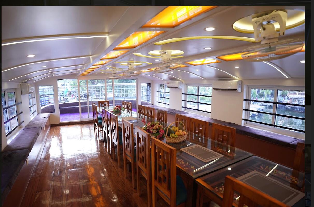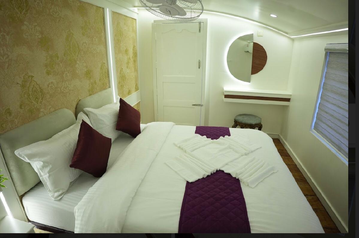 Immerse yourself in the beauty of Alleppey’s backwaters aboard our five-bedroom deluxe houseboat. Designed for families or groups, this houseboat offers spacious air-conditioned rooms, modern facilities, and a private deck to enjoy stunning views. Savor delicious Kerala cuisine freshly prepared by our onboard chef as you glide through peaceful canals and lush greenery. Experience unmatched comfort and tranquility—book your Alleppey houseboat stay today!